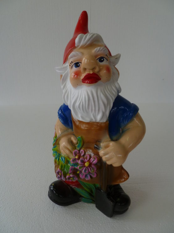 Gartenzwerg mit Blumen und Schaufel