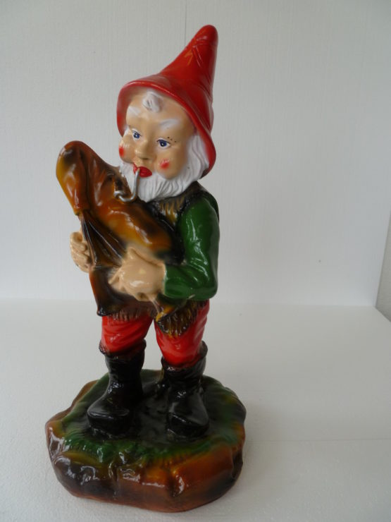 Gartenzwerg mit Pfeife an Fass angelehnt