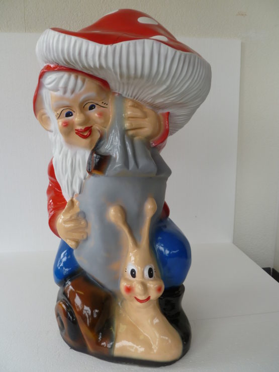 Gartenzwerg mit Fliegenpilz und Schnecke