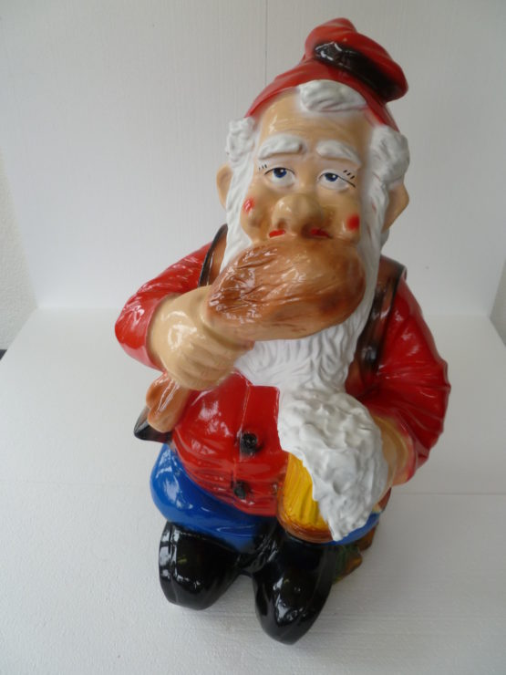 Gartenzwerg mit Pfeife an Fass angelehnt
