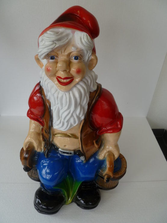 Gartenzwerg mit Pfeife an Fass angelehnt