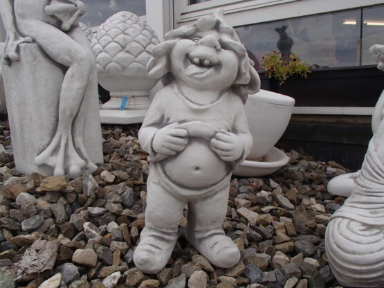 Gartenzwerg mit Pfeife an Fass angelehnt